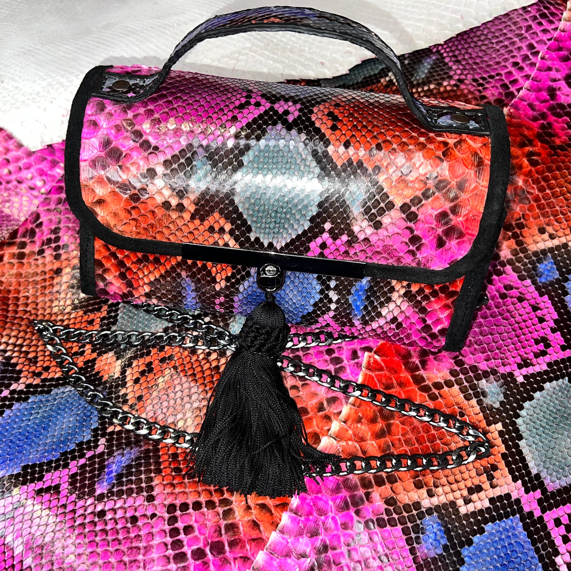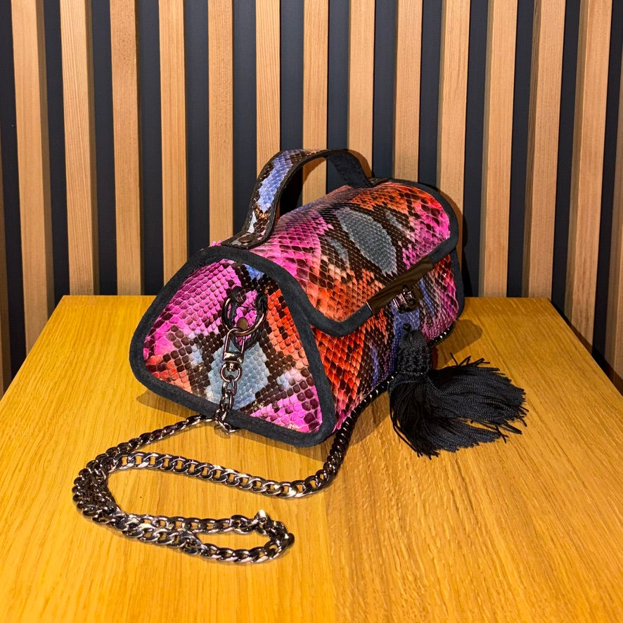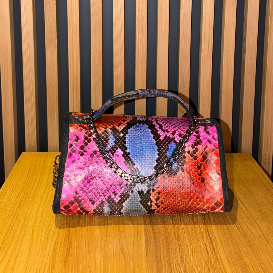 Sac exclusif réalisé à la main en véritable cuir de serpent python, soigneusement teint de manière artisanale afin d’obtenir une combinaison sophistiquée de tons vibrants et harmonieux. Chaque pièce est unique, avec des nuances irrépétibles qui soulignent son caractère et sa personnalité.